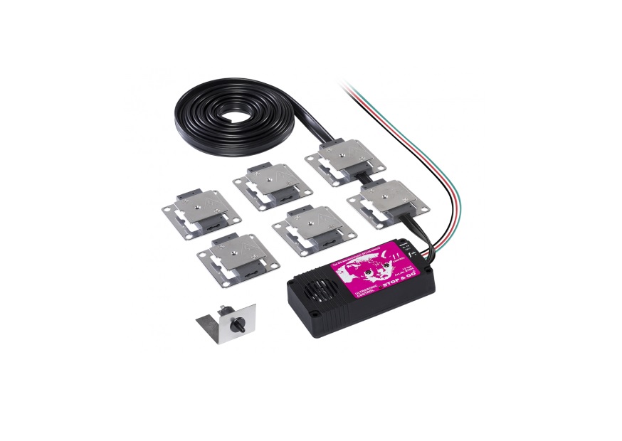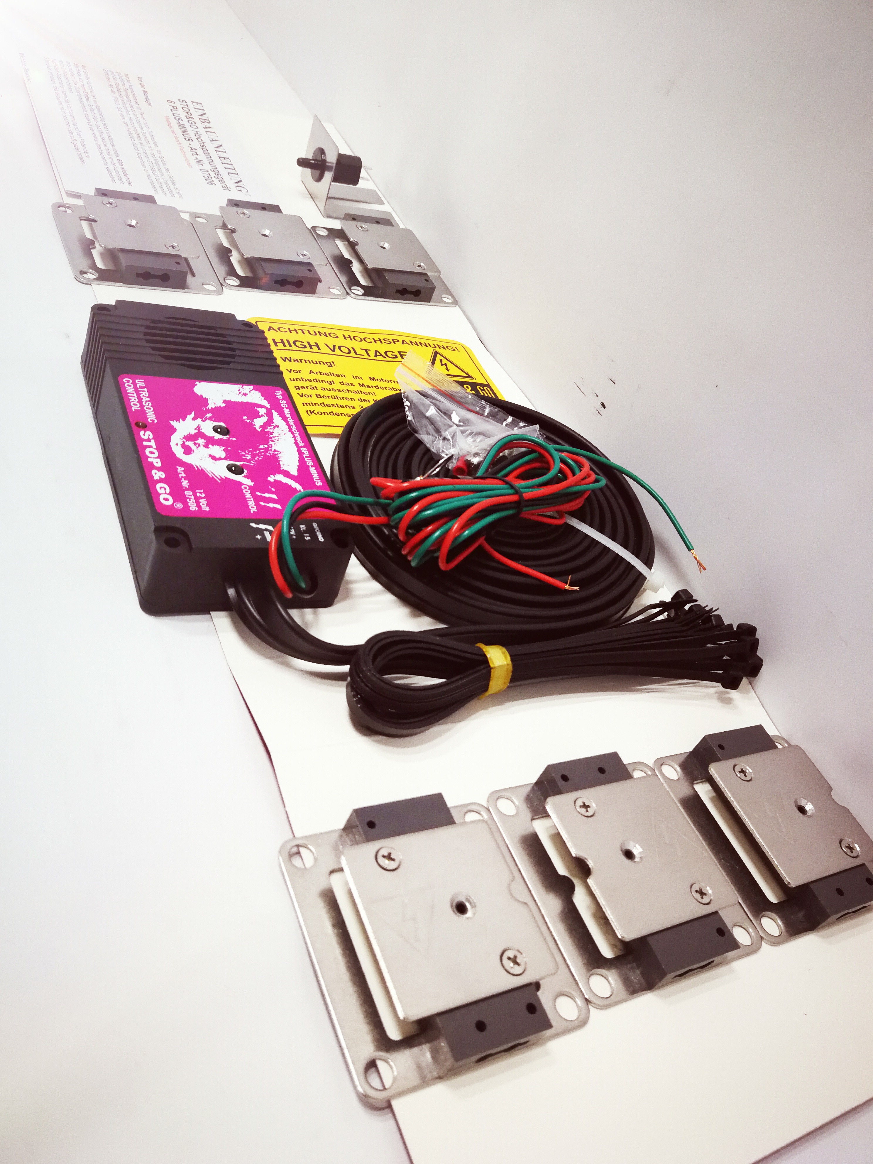 Hochspannungs-Ultraschall-Kombinationsgerät mit PLUS-MINUS Edelstahlkontaktplatten. Sechs Edelstahlkontaktplatten geben bei Berührung einen ungefährlichen, jedoch effektiven elektrischen Stromschlag ab, vergleichbar mit dem Weidezaunprinzip. Durch den vermehrten Einsatz von elektrisch nicht leitfähigen Materialien wie z. B. Kunststoff in modernen Fahrzeugen könnte es passieren, dass der Marder keinen elektrischen Stromschlag erhält. Deshalb ist dieses Gerät 2-polig, d. h. der Marder erhält bei Berührung – unabhängig von der Beschaffenheit des Motorraumes – einen elektrischen Stromschlag.